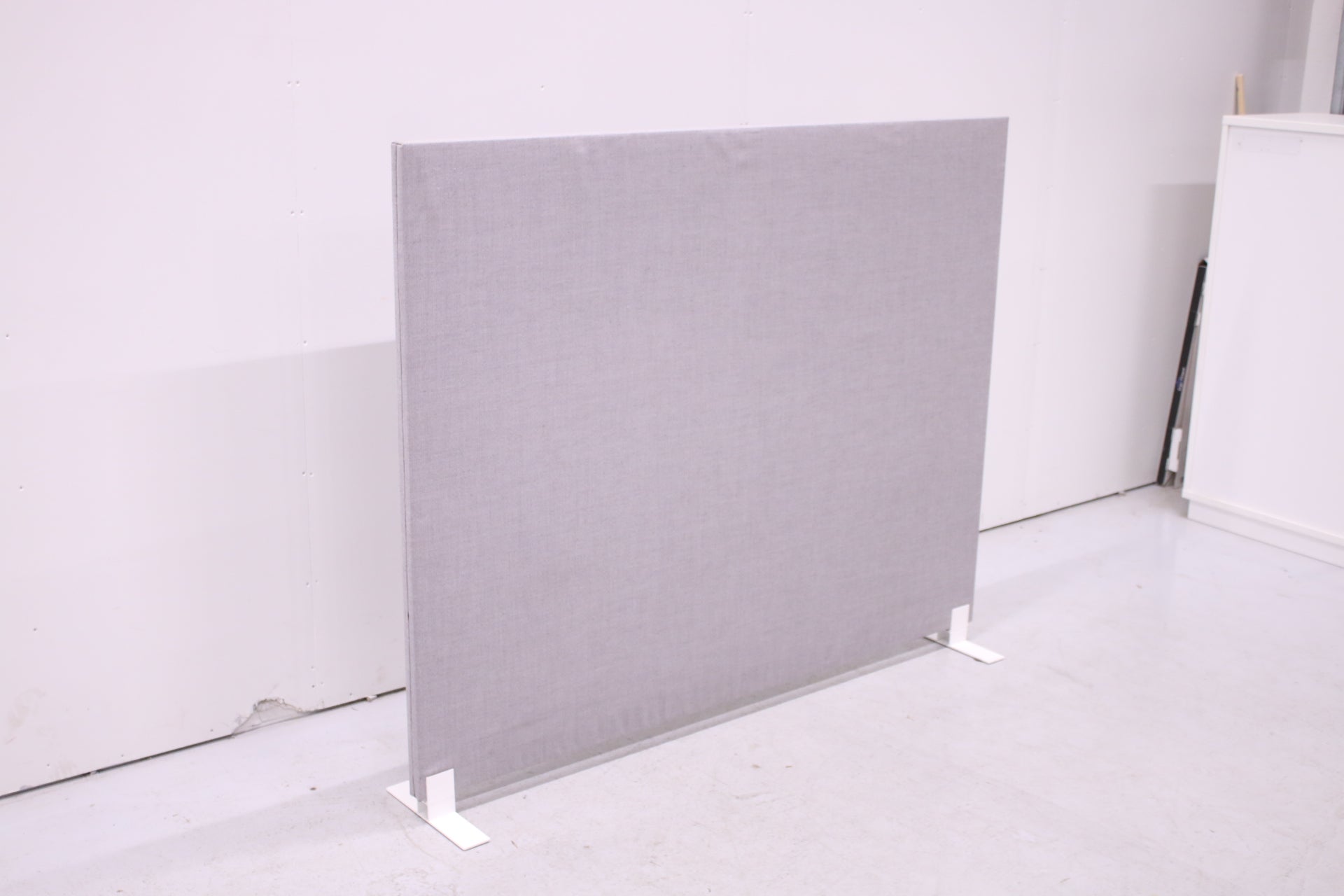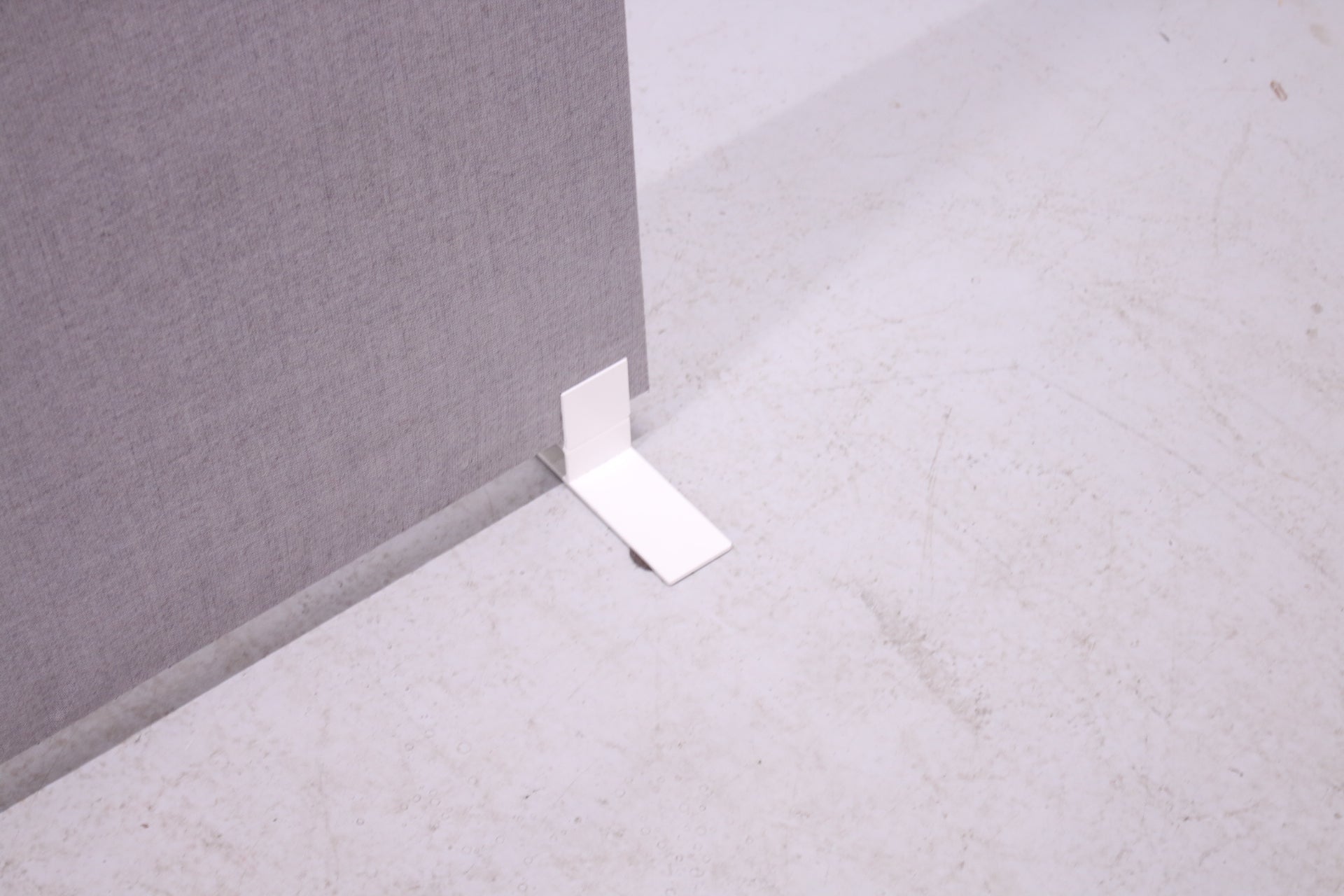 Martelan harmaa lattiaseinäke. Tyylikäs tilanjakaja akustoivalla efektillä. Harmaa verhoilu, valkoiset jalat.